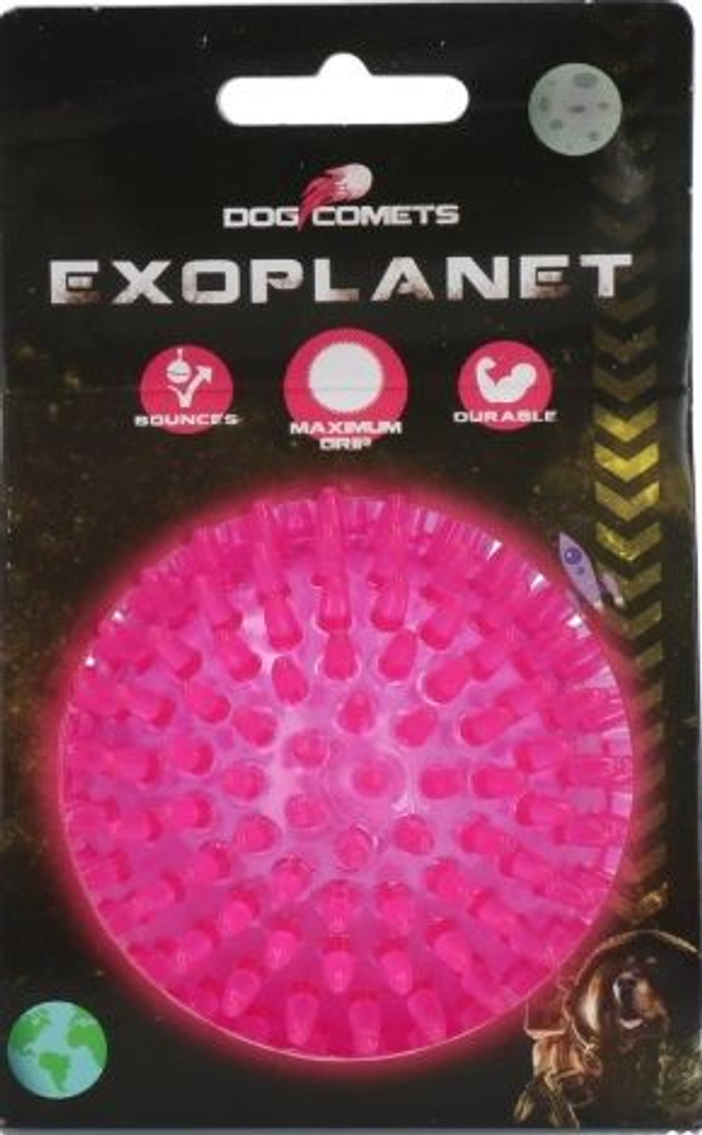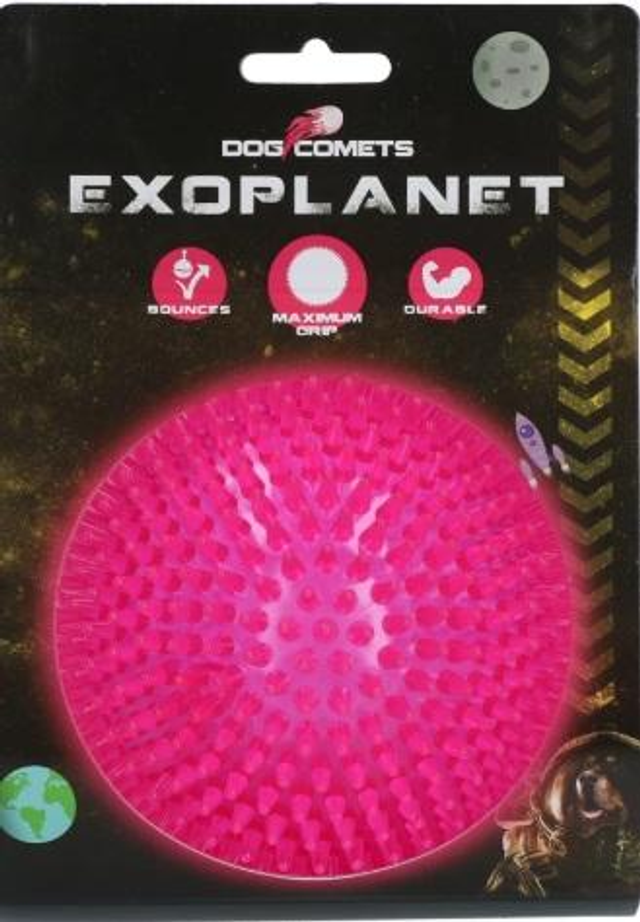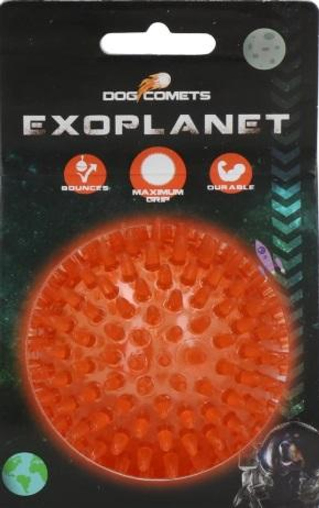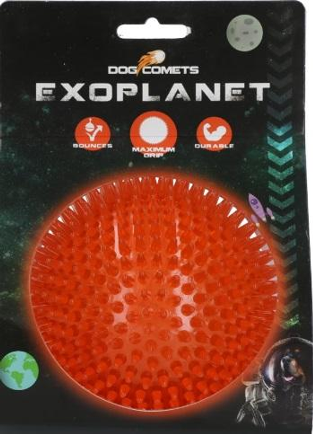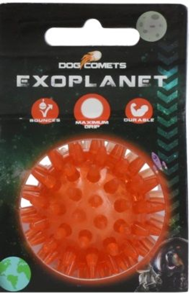 Deze bal vol met stevige maar flexibele 'stekels' zorgt voor urenlang speelplezier en helpt tegelijkertijd het gebit te reinigen! De Dog Comets Exoplanet stuitert perfect, drijft op water en is dankzij de stekels makkelijk vast te pakken. Deze eigenschappen zorgen ervoor dat de bal erg geschikt is voor het apporteren en om mee te spelen in het water. Als de hond de bal in de bek vastpakt, dan masseren de stekels het tandvlees en ze helpen de tanden te reinigen. De pieper in het midden zorgt voor extra stimulans tijdens het spelen.