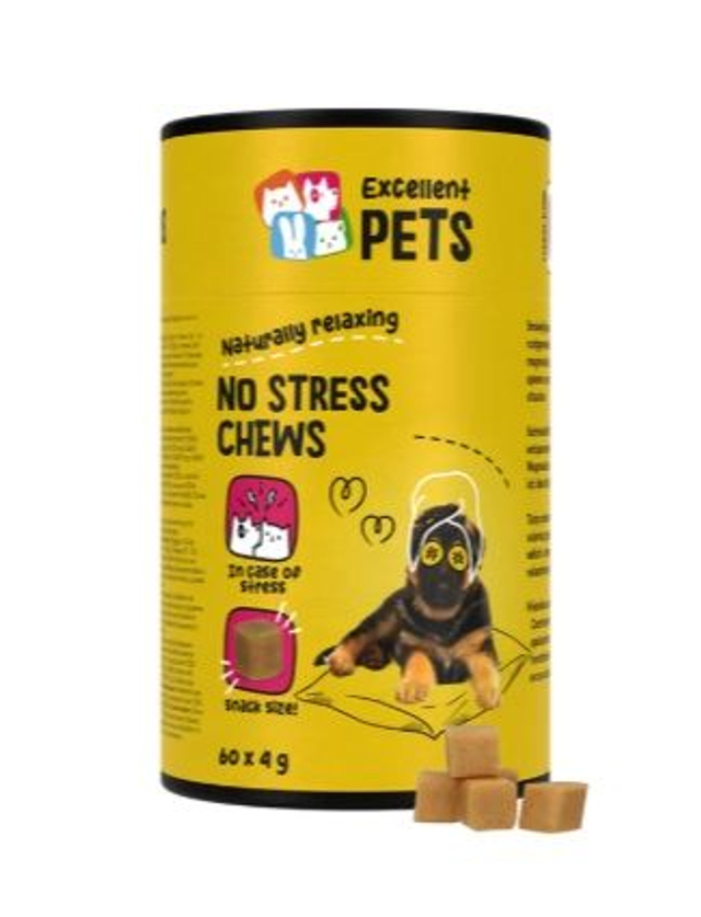 Excellent Pets No Stress Soft Chews bevat onder andere L-tryptofaan, valeriaan, groene thee en magnesium. L-tryptofaan is een essentieel aminozuur, dat bijdraagt aan de productie van serotonine, een stof die zorgt voor een gevoel van rust en welzijn. Daardoor worden honden rustiger in stressvolle situaties. Magnesium heeft een gunstig effect op het zenuwstelsel en de spieren en het stimuleert ontspanning. Valeriaan heeft een rustgevend effect en is ideaal bij spanning of in stresssituaties. Groene thee is rijk aan antioxidanten, die helpen het lichaam te beschermen tegen schadelijke invloeden. Ter ondersteuning bij stress en spanning, zoals een bezoek aan de dierenarts, de trimsalon, bij onweer of bij vuurwerk. Ter ondersteuning van de spieren en het zenuwstelsel